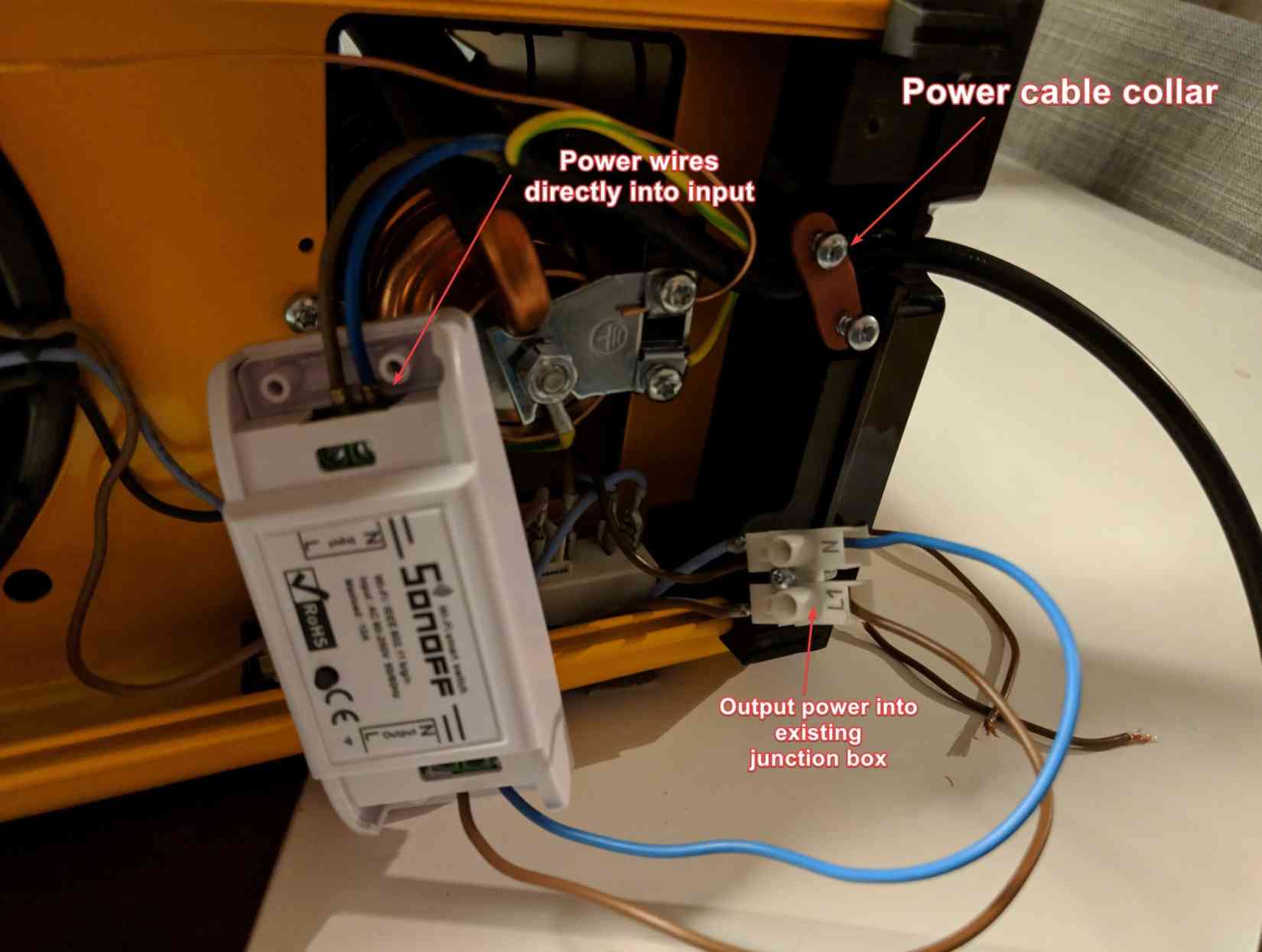 To avoid damaging the machine, I used blu-tack to secure the Sonoff in-place rather than screwing it, but sticky-tape would probably work too (I told you this was a hack). To finish up, secure the power cable brace from earlier, then the junction box, being sure that none of your cabling touches the copper elements or the side of the machine.