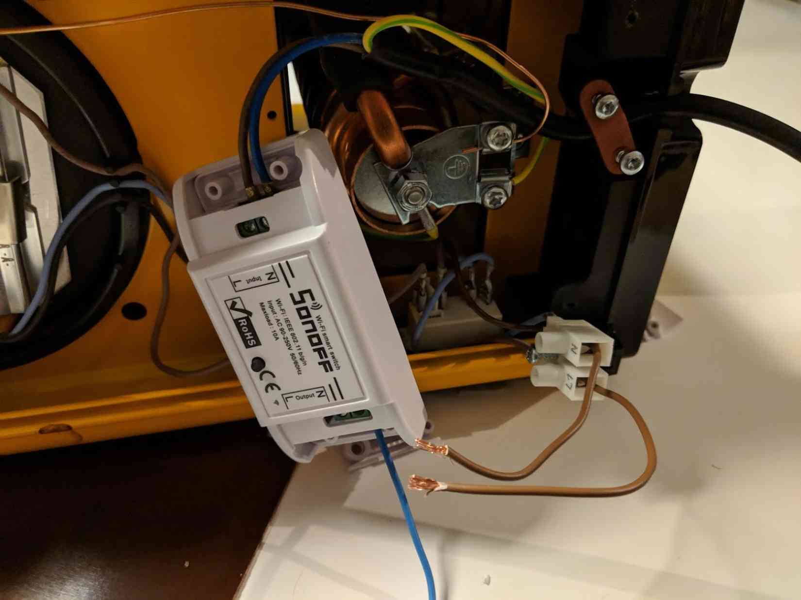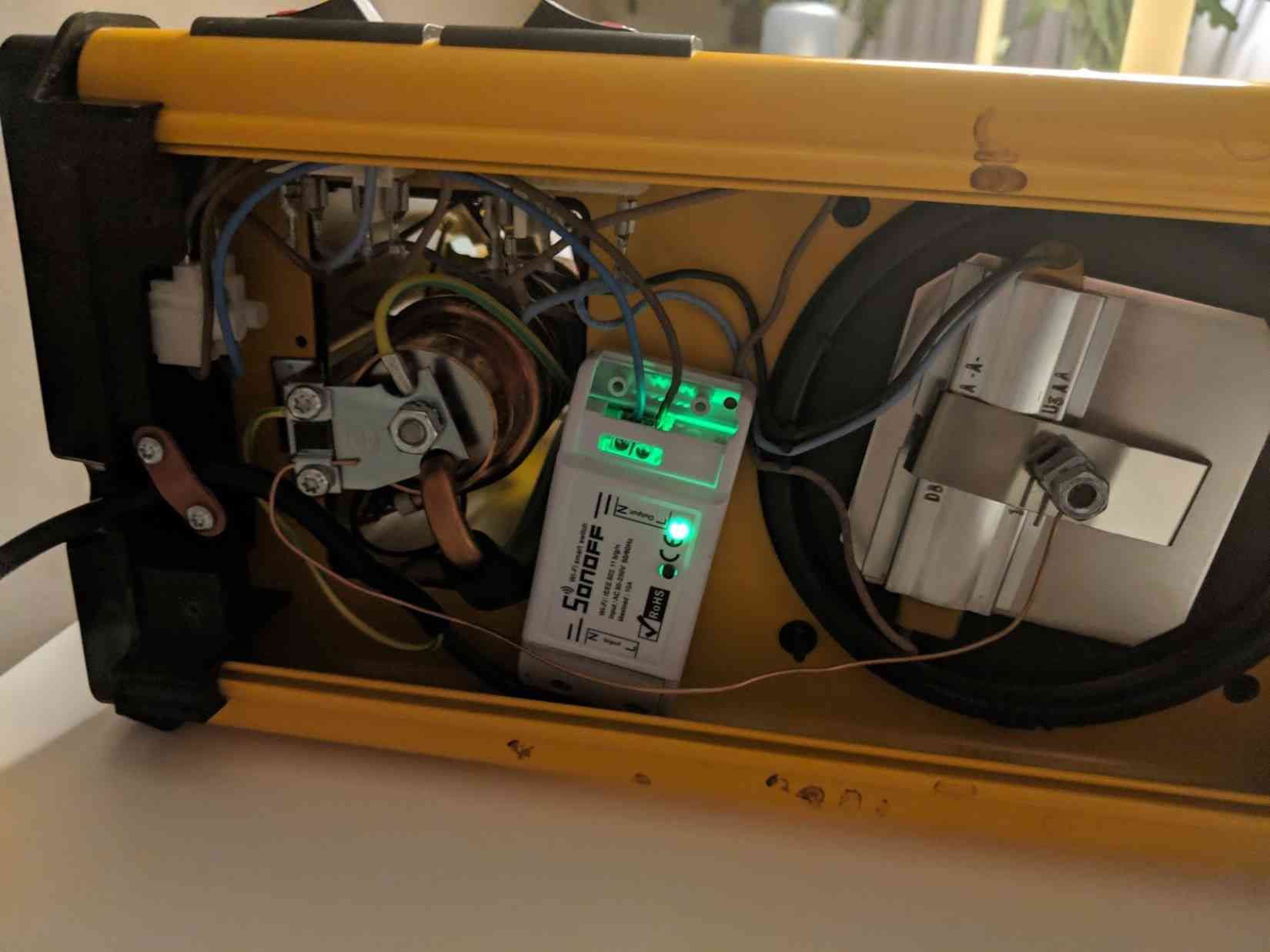 I decided to volunteer my beautiful coffeemaker, a bright yellow Moccamaster, as tribute: it's as dumb as it gets these days, and theoretically has simple enough wiring along with enough space to splice in the Sonoff within the coffee maker directly.